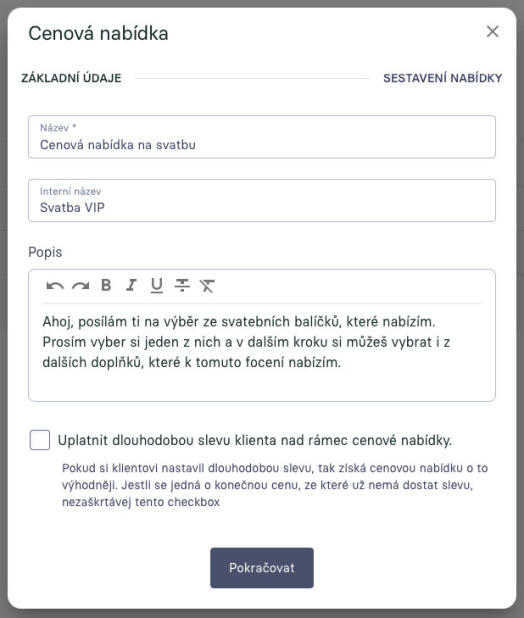 Vytvoř si novou cenovou nabídku v záložce Šablony - Cenové nabídky a zvol kategorii služeb, ke které bude nabídka přiřazena (třeba svatební focení). Vyplň název (to je to, co uvidí v nadpisu nabídky klient), interní název (to naopak uvidíš ty, když jí budeš přiřazovat, aby ses v tom vyznal) a popis, tedy informace, které budou pro klienta doplňující - třeba že prosíš o výběr jedné ze služeb a informace o tom co bude následovat atd. Můžeš si také vybrat, jestli chceš uplatnit dlouhodobou slevu klienta nad rámec cenové nabídky. Jelikož svému klientovi můžeš nastavit dlouhodobou slevu na všechny jeho rezervace (záložka Moji klienti), tak se u cenové nabídky můžeš rozhodnout, jestli mu ta jeho sleva ještě bude platit nad rámec cenové nabídky a nebo jestli mu děláš už "nejlepší možnou" cenovou nabídku a nechceš, aby se ještě jeho dodatečná sleva odečetla.