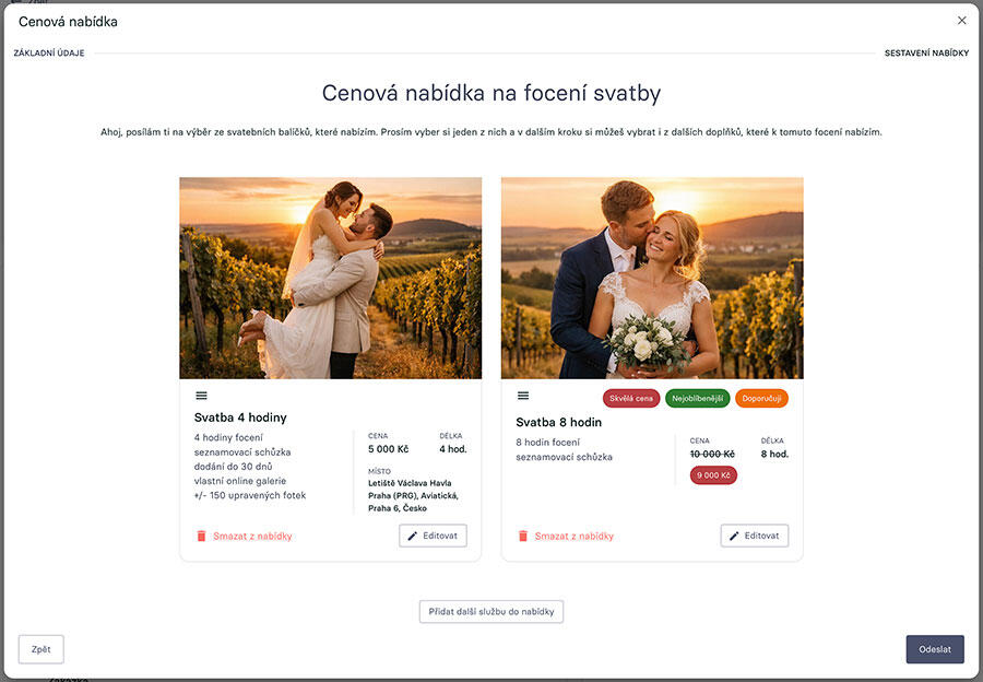 V rámci poptávky mu můžeš poslat cenovou nabídku, kde si klient sám vybere ze služeb, které mu nabídneš. Nejen, že mu vybereš konkrétní služby z těch co nabízíš, ale můžeš mu nastavit i individuální cenu, označit mu službu jako doporučenou nebo nejoblíbenější a nebo ji individuálně označit třeba jako Super cena, skvělá akce, atp. Taky mu můžeš nabídnout individuální příplatky, upravit popis služby atp. = zkrátka a jednoduše, dáš klientovi na výběr ze služeb, které můžeš ještě individuálně přizpůsobit. Pokud si nějakou službu vybere, projde klasickou cestou košíku objednávky a pokud to u služeb požaduješ, proběhne i platba zálohy.