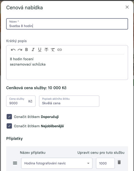 Výhoda nabídky je, že můžeš jednotlivé služby měnit individuálně a není potřeba, aby měly přednastavený text a ceny. Každou službu můžeš editovat, změnit její název, upravit popis, změnit příplatky, označit službu jako Doporučuji nebo Nejoblíbenější a samozřejmě můžeš upravit i cenu. Pokud nastavíš nižší cenu služby než je ceníková, pak se automaticky původní cena přeškrtne a do akčního červeného rámečku se napíše cena nová. Zroveň si můžeš vybrat, jak chceš pojmenovat označení akčního štítku - třeba VIP cena.