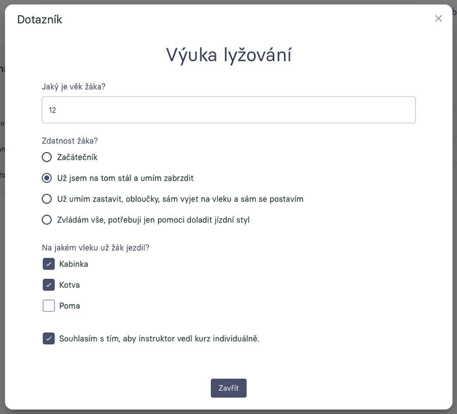 Dotazníky jsou velmi příjemnou funkcionalitou pro získání více informací od klienta. Ať už jej používají například v lyžařské škole, kde chtějí u každé rezervace vědět jméno, věk a zkušenosti žáka ještě předtím, než výuka začne, tak třeba u fyzioterapeuta, který se vás dopředu zeptá, co vás trápí, případně jestli berete nějaké léky.