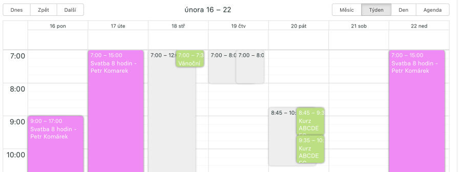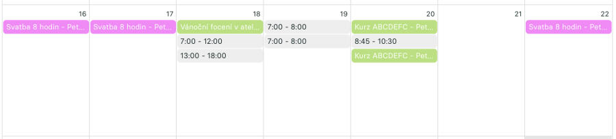 V kalendáři ti šedou plochou zobrazujeme volné termíny k rezervaci, které sis nastavil - tedy časové "sloty", kdy sis zvolil, že máš volno a kdy si u tebe klienti mohou rezervovat nějakou konkrétní službu. Tyto časové sloty se mohou i překrývat. Klidně můžeš mít to, že od 8 do 12 hod jde rezervovat jen 1 služba, ale od 9 do 16 hod jdou všechny služby. Můžeš si najít ideální kombinaci toho, co chceš kdy nabízet.
