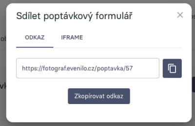 Kliknutím na ikonku sdílení se zobrazí odkaz, který můžeš poslat klientovi a zobrazí se mu daný formulář.