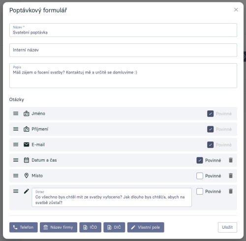 Poptávkový formulář se skládá z názvu (nadpis formuláře), popisu (úvod pro klienta) a pak z jednotlivých otázek. Některé z bodů jsou povinné z podstaty (Jméno, Příjmení, E-mail) - na základě těchto informací pak zakládáme poptávku a klienta k tobě do systému. Další otázky jsou již pro tebe volitelné jestli je budeš vyžadovat či nikoliv. A mohou to být přednastavená pole jako Datum a čas či Místo (s vyhledáváním na Google maps) nebo Vlastní pole, které si můžeš pojmenovat jak chceš a vyžadovat po klientech jakoukoliv informaci považuješ za důležitou.