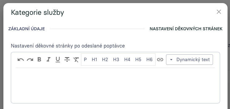 V nastavení kategorie služeb, tedy tam kde vybíráš, jaký formulář se má u dané kategorie používat a jaký pracovní postup se má zvolit, si můžeš zároveň nastavit texty, které se mají klientovi ukázat po odeslání poptávky. Pokud necháš políčko prázdné, zobrazí se náš přednastavený text. Můžeš si tam ale sestavit vlastní děkovnou stránku, kde můžeš využít i dynamické texty, které doplní odkaz na zakázku, název služby, jméno, datum, cenu a jiné...