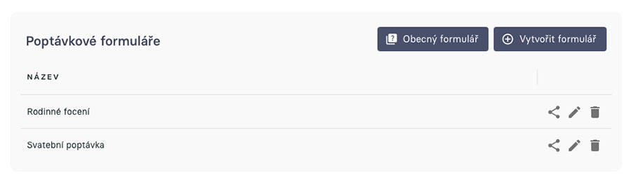 Můžeš mít několik různých poptávkových formulářů, například jiný pro focení svatby, jiný pro vánoční rodinné focení, jiný pro individuální workshop. Každý z těchto formulářů můžeš individuálně sdílet a nebo si jej designově přizpůsobit a vložit k sobě na web. Zároveň existuje tlačítko na Obecný formulář. To je formulář, kde si klient může překliknout o kterou kategorii služby má zájem a podle toho se formulář změní a přizpůsobí - jedná se tedy o takový univerzální poptávkový formulář, který můžeš mít na jednom místě na webu.