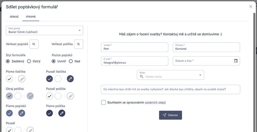 Přes záložku IFRAME si můžeš poptávkový formulář vložit k sobě do webových stránek. A nejen vložit, ale můžeš si jej i designově přizpůsobit tak, aby odpovídal designu tvého webu a nebyla to "pěst na oko" - nastavit velikosti a umístění popisků, zaoblení rámečků, typ písma, barvy textu, rámečků či pozadí. Po nastavení se ti zobrazí kód, který vložíš jako HTML k sobě do webu a bude se ti tam poptávkový formulář v daném designu zobrazovat.