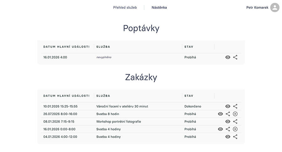 Po přihlášení má na nástěnce přehled o všech svých poptávkách a zakázkách (rezervacích) a může se prokliknout do každé z nich, případně jít na přehled tvých služeb a nebo, kliknutím na své jméno vpravo nahoře, do svého profilu, kde si může nahrát profilovou fotografii a změnit osobní údaje.