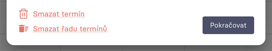 Smazání termínů lze rozdělit - buď se smaže ten jeden konkrétní (víš, že ten den zmizíš na výlet, tak smažeš jeden termín) a nebo smažeš celou řadu termínů s chytrou logikou - smaže se ten vybraný a všechny novější, starší ne. Takže pokud cheš změnu provést třeba až za 14 dnů, najdeš si v kalendáři ten den od něj celou řadu novějších termínů smažeš. Smažou se všechny, které mají stejné nastavení času.