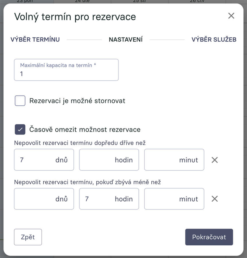 V druhém kroku si nastavíš omezení rezervací. Vyplníš maximální kapacitu na termín, tedy jestli se ti na daný čas může zarezervovat více lidí. Pokud se objednává klient ke kadeřnici, tak nejspíše více lidí najednou nezvládne. Pokud ale pořádáš školení, cvičení nebo workshop, pak chceš, aby se ti na daný termín zarezervovalo třeba 20 lidí najednou - a to si povolíš právě tady.