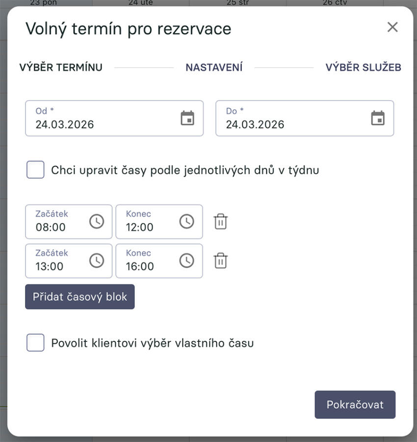 Určitě se ti bude hodit i upravovat časy podle jednotlivých dnů v týdnu, zejména pokud děláš termíny na měsíce dopředu. Jednoduše si vytvoříš časové bloky pro každý den - třeba v pondělí celý den, v úterý jen dopoledne, o víkendu vůbec. A systém ti všechno dopředu předvyplní.